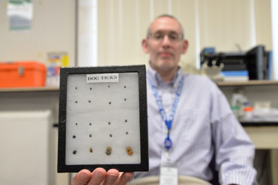 Telegraph photo: ADAM URQUHART Health officer and laboratory director at the city’s Division of Public Health & Community Services Ren Beaudoin shows off a collection of dog ticks.