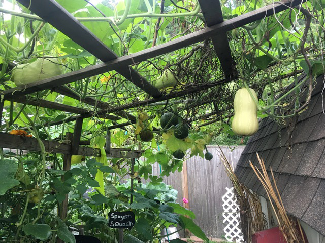 Within the garden, one will come across many different types of perennials, annuals, produce such as kale, beets, spaghetti squash, Swiss chard, tomatoes and carrots, along with succulents. There are even birds nests and houses, along with other trinkets.