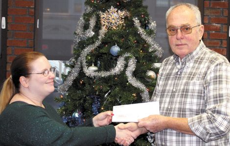 Peter Duke, who came in second place in the Telegraph’s Find the Elf contest, is presented the $100 prize by Monique Savoie of The Telegraph.