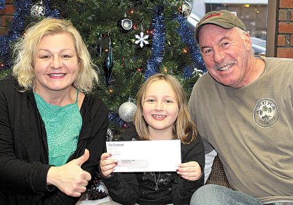 Hayden Noel won $50 for being the third-place finisher in The Telegraph’s Find the Elf contest. With her are Telegraph employee Heather Marcheterre and Hayden’s dad, Steve Noel.