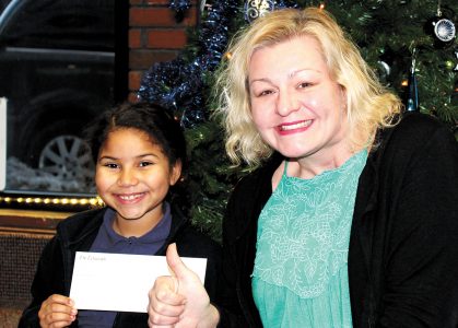 Hayden Noel won $50 for being the third-place finisher in the Telegraph's Find the Elf contest. With her are Telegraph employee Heatehr Marcheterre and Hayden's dad, Steve Noel.