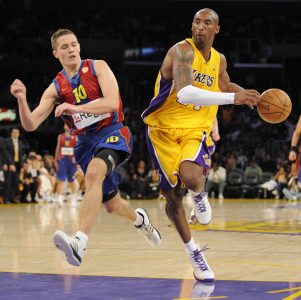 - FC Barcelona’s Jaka Lakovic, left, guards Los Angeles Lakers guard Kobe Bryant during the first half of their NBA preseason basketball game in Los Angeles, Saturday, Oct. 18, 2008. (AP Photo/Chris Carlson)