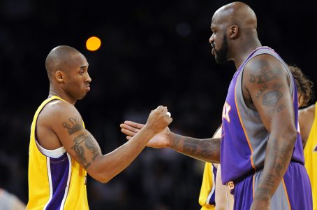 - Los Angeles Lakers guard Kobe Bryant, left, and Phoenix Suns center Shaquille O’Neal greet each other prior to their NBA basketball game Thursday, Feb. 26, 2009, in Los Angeles. (AP Photo/Mark J. Terrill)