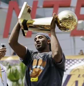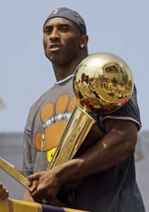 - FILE – In this June 14, 2009 file photo Los Angeles Lakers’ Kobe Bryant holds the Larry O’Brien championship trophy and finals MVP trophy after the Lakers defeated the Orlando Magic 99-86 in Game 5 of the NBA basketball finals in Orlando, Fla. Bryant, the 18-time NBA All-Star who won five championships and became one of the greatest basketball players of his generation during a 20-year career with the Los Angeles Lakers, died in a helicopter crash Sunday, Jan. 26, 2020. He was 41. (AP Photo/David J. Phillip)