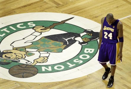 - Los Angeles Lakers guard Kobe Bryant walks past the Boston Celtics logo at center court during the fourth quarter in Game 5 of the NBA basketball finals Sunday, June 13, 2010, in Boston. The Celtics won 92-86. (AP Photo/Charles Krupa)
