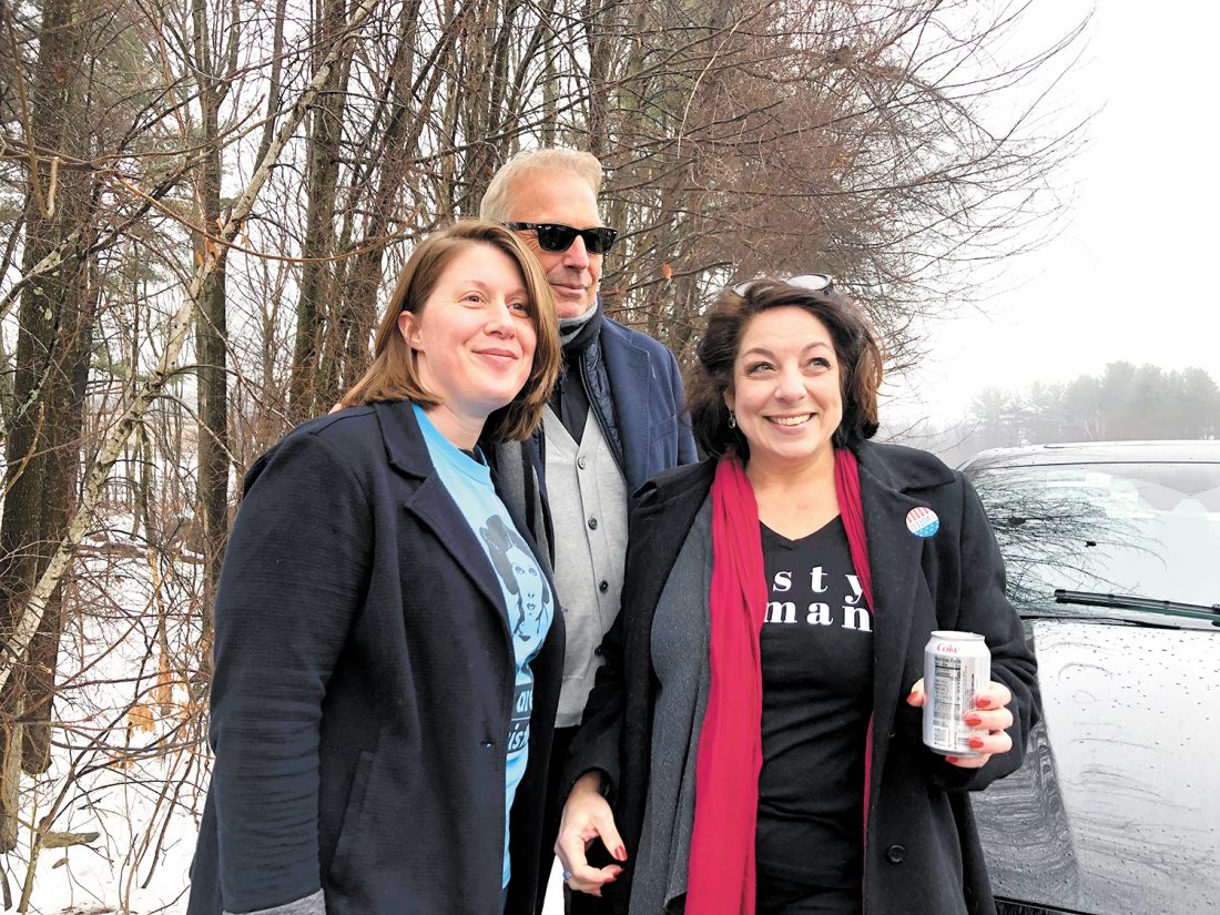 Karin Cevasco, left, and Jennifer Siegrist, right, bumped into actor Kevin Costner at the Milford polls.