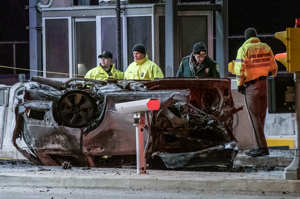 State police say a 2017 Subaru Forester crashed into a booth at the Hooksett toll plaza on Interstate 93 South just before 2 a.m. Friday and caught fire, bursting into flames. Investigators have not yet identified the driver, who was the only occupant of the vehicle.