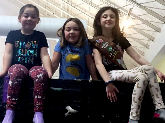 Sisters Ailsa and Brynja McDonald sit atop the climbing wall at Green Mountain Rock Climbing Center in Quechee, Vermont, with Aurora Mills. The Girl Scouts funded their trip to the center with fall product sales. (Courtesy photo)