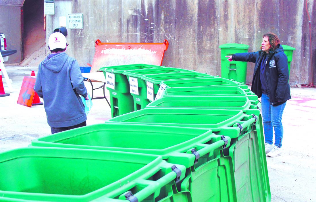 Each bin is labeled for specific items, and cones will be set up to help direct the flow of traffic.