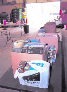 Some of the items that residents donated to the city and non-profit agencies Monday morning are lined up on a table inside a Public Works building. The collection continues today and Wednesday from 9 a.m. - noon at 9 Stadium Drive. Telegraph photo by DEAN SHALHOUP