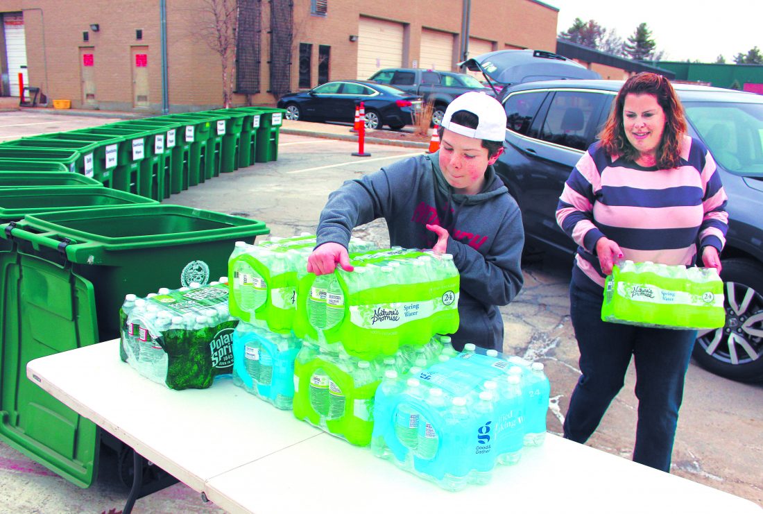 Jenna Tompkins and her son, Andrew Cullinane, load cases of bottled water onto a table at the Public Works Department's collection site, where residents donated goods ranging from water, paper items and protective gear to the city and various non-profit agencies. The donation station will be open today and Wednesday from 9 a.m. - noon. Telegraph photo by DEAN SHALHOUP