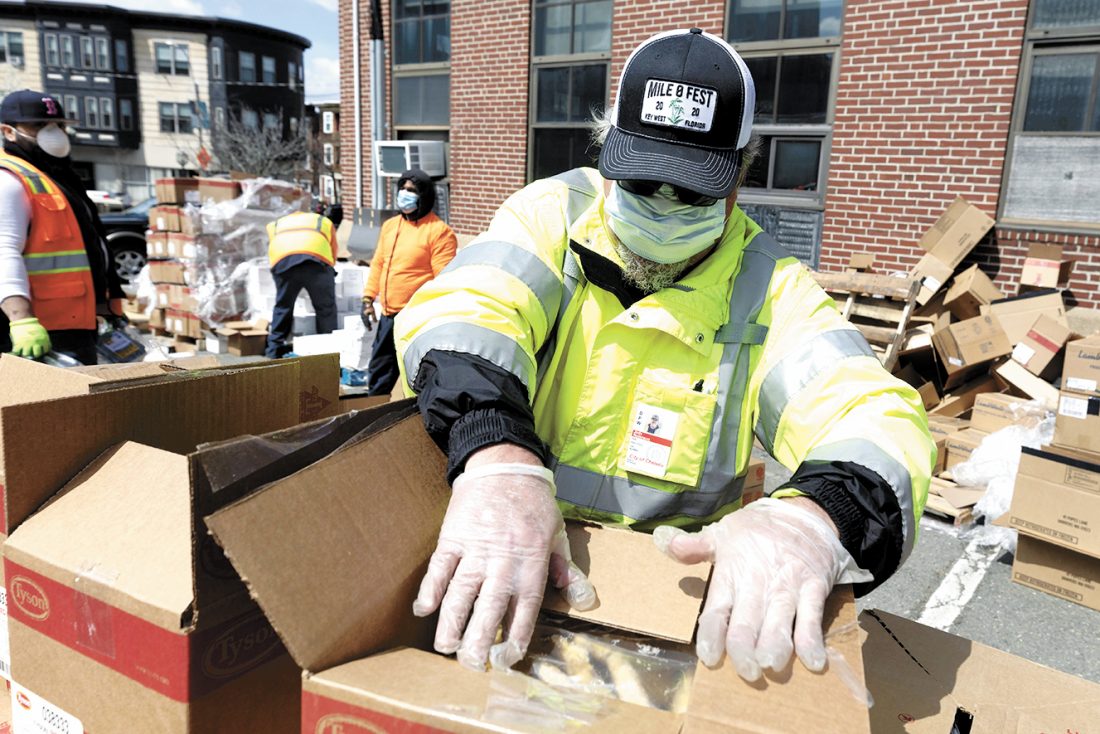 Department of Public Works employee Jody Robinson distributes food outside City Hall, Friday, April 17, 2020, in Chelsea, Mass. (AP Photo/Michael Dwyer)