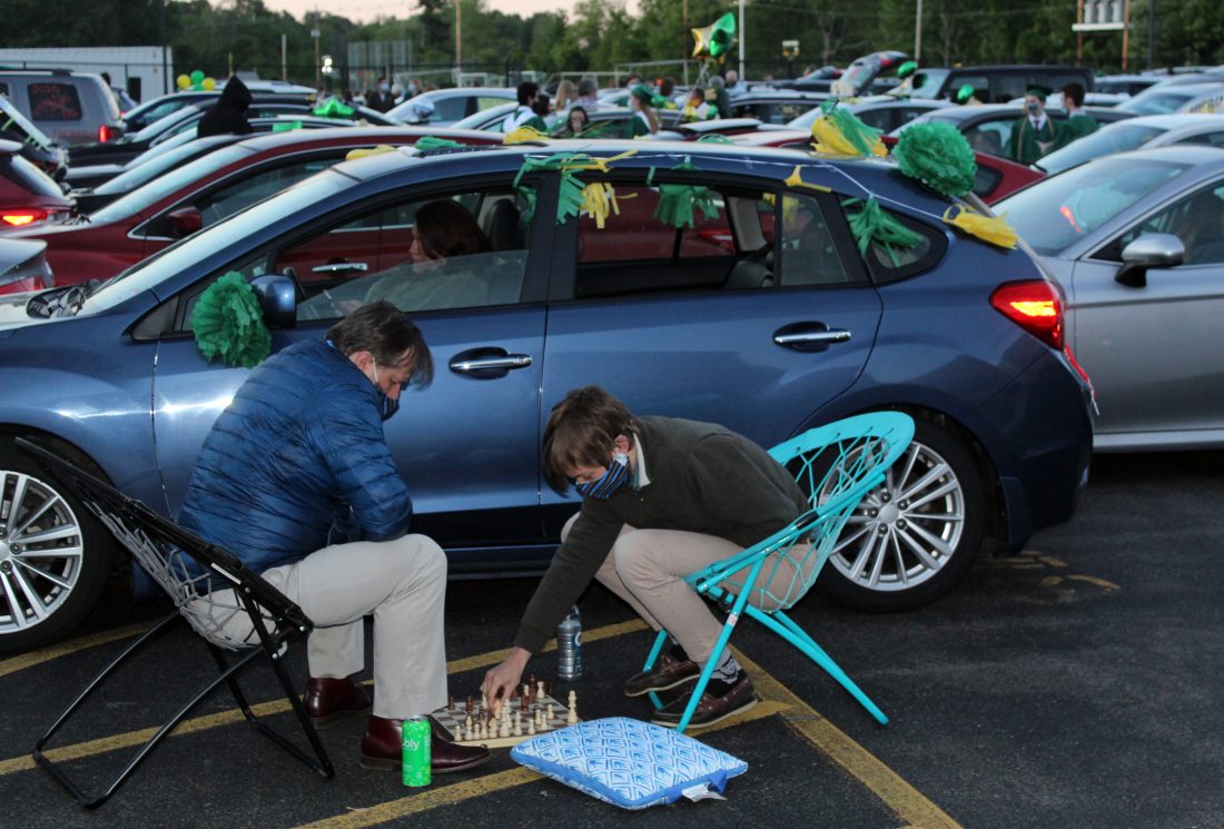 Telegraph photo by DEAN SHALHOUP Alex Romanauskas, a 1990 Bishop Guertin graduate, and his son, Rowan, a sophomore, play a game of chess while waiting for Guertin's unique 2020 commencement to begin Sunday night. Among the grads was their son and brother, Gabriel Romanauskas.