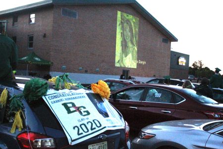 There, graduates’ family members were directed to park their vehicles all facing the back wall, which served as the “screen” for the photos and videos recorded earlier.