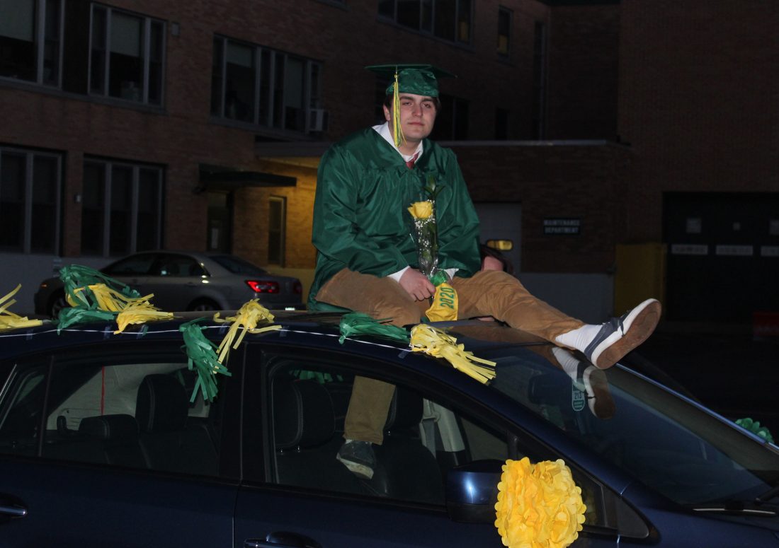 - Telegraph photo by DEAN SHALHOUP Bishop Guertin graduates posed for photos next to a decked-out vehicle while awaiting the start of Guertin’s unique commencement Sunday night.