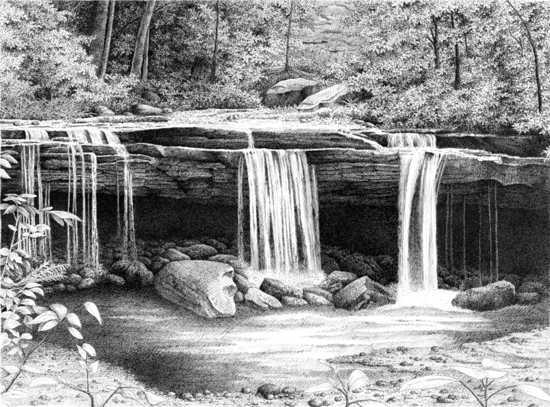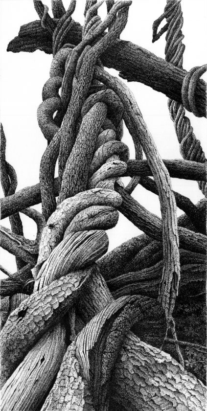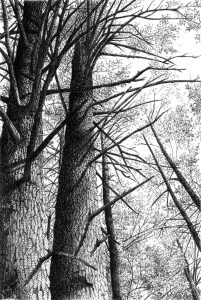 Searle said that she herself finds inspiration from being on site in a natural surrounding which is often the setting for her art. She uses photographs or rough sketches to formulate her ideas before she returns to her studio to begin creating her pen and ink drawings.