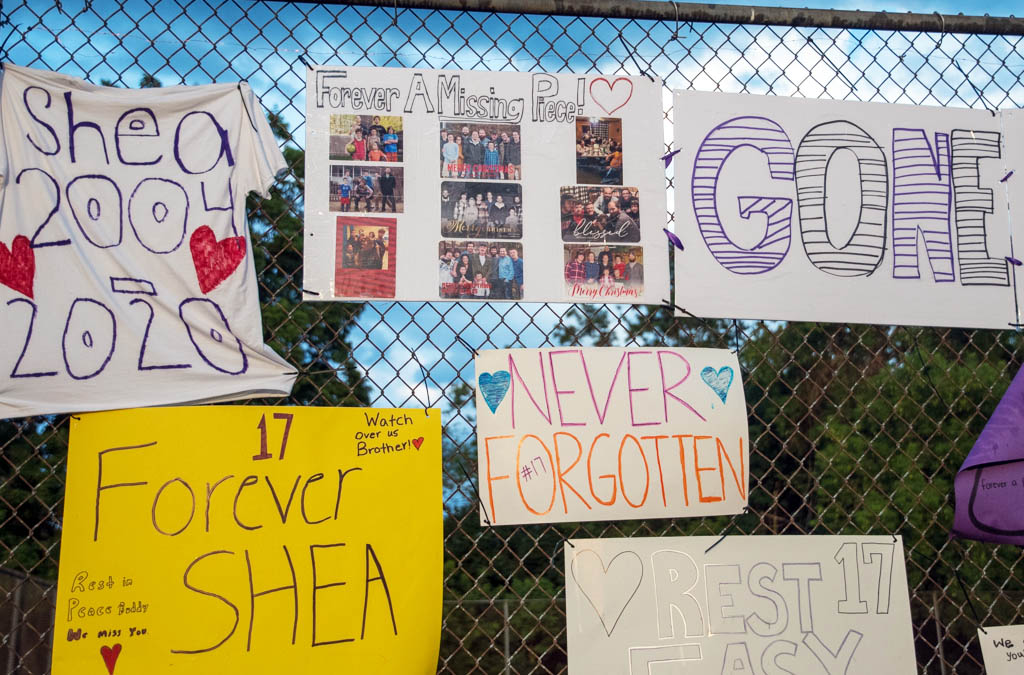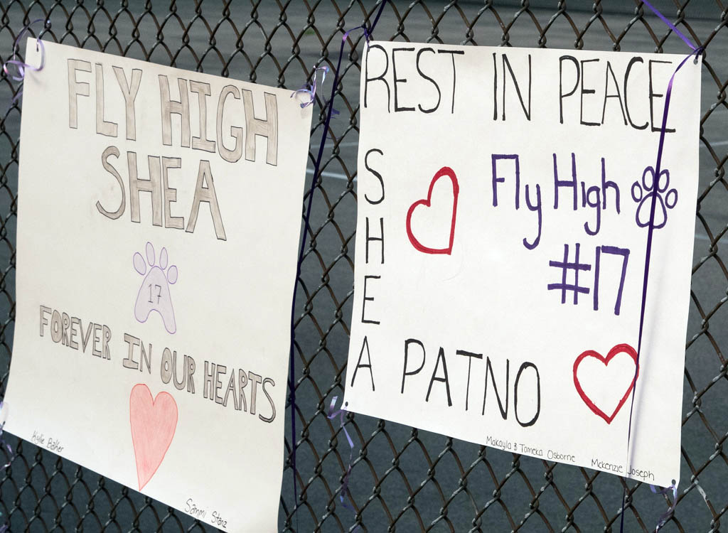 - Photo by JEFFREY HASTINGS Some of the dozens of signs and posters that were pinned to fences at the Shady Lane park Monday evening pay tribute to Shea Patno, the 15-year-old Nashua resident who drowned in Dunstable last week.