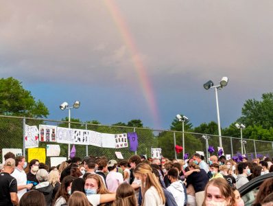 Photo by JEFFREY HASTINGS A rainbow breaks out over the Shady Lane park as some of the nearly 1,000 people who attended a candlelight vigil Monday in honor of 15-year-old Shea Patno embrace and share condolences. Patno drowned last week while swimming with friends in Dunstable.