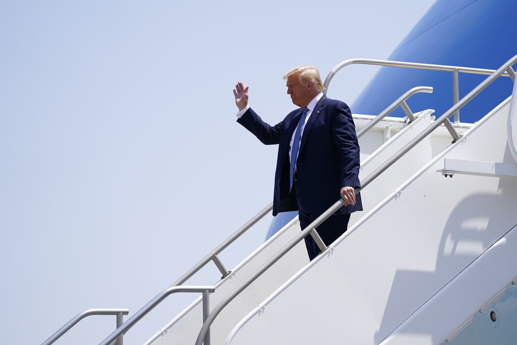 President Donald Trump exits Air Force One as he arrives at Yuma International Airport, Tuesday, Aug. 18, 2020, in Yuma, Ariz. (AP Photo/Evan Vucci)