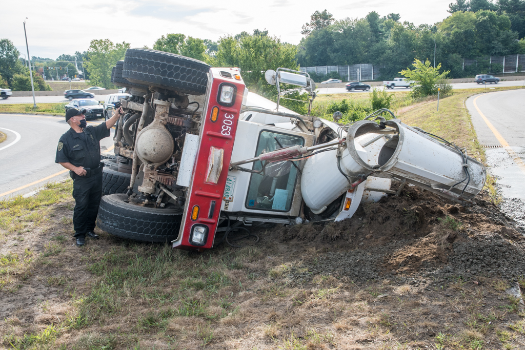Crews arrived on the scene at about 8 a.m., finding a truck carrying concrete had rolled over and was on its side. The driver, who was able to get out of the truck, was medically evaluated and refused treatment.