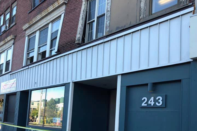 Part of the 200 block of Main Street is blocked off after part of the facade of 243 Main St. began to collapse.