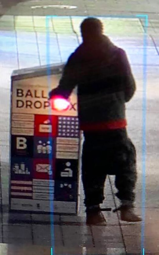 This surveillance image provided by the Boston Police Department shows a man approaching a ballot drop box outside the Boston Public Library, early Sunday, Oct. 25, 2020, in downtown Boston. Massachusetts election officials say a fire was set at the ballot drop box holding more than 120 ballots in what appears to have been a “deliberate attack." Boston Police say that an arson investigation is underway and the person shown in this surveillance image is a person of interest. (Courtesy of Boston Police Department via AP)