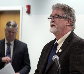 - Telegraph photo by DEAN SHALHOUP Scott Slattery, executive director of Greater Nashua Habitat for Humanity and a former longtime employee of Nashua’s Harbor Care, speaks briefly at Monday’s announcement by HUD officials that Harbor Care has been designated an EnVision Center. At left is Harbor Care president and CEO Peter Kelleher.