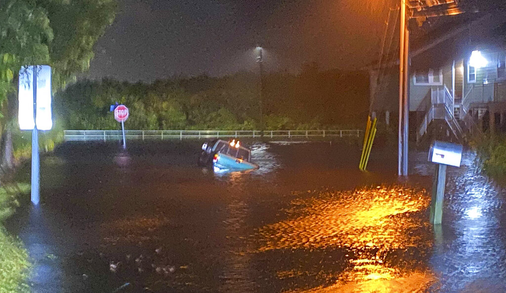 A vehicle lists in floodwaters late Wednesday, Nov. 11, 2020, as Tropical Storm Eta nears Safety Harbor, Fla. (Luis Santana/Tampa Bay Times via AP)