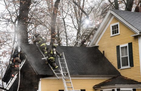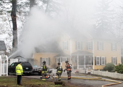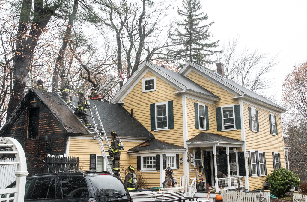 Photo by Jeffrey Hastings Firefighters got the upper hand on a fast-moving fire at 482 Daniel Webster Highway in Merrimack Monday morning, confining most of the damage to the ell to the large building estimated to be 120 years old.