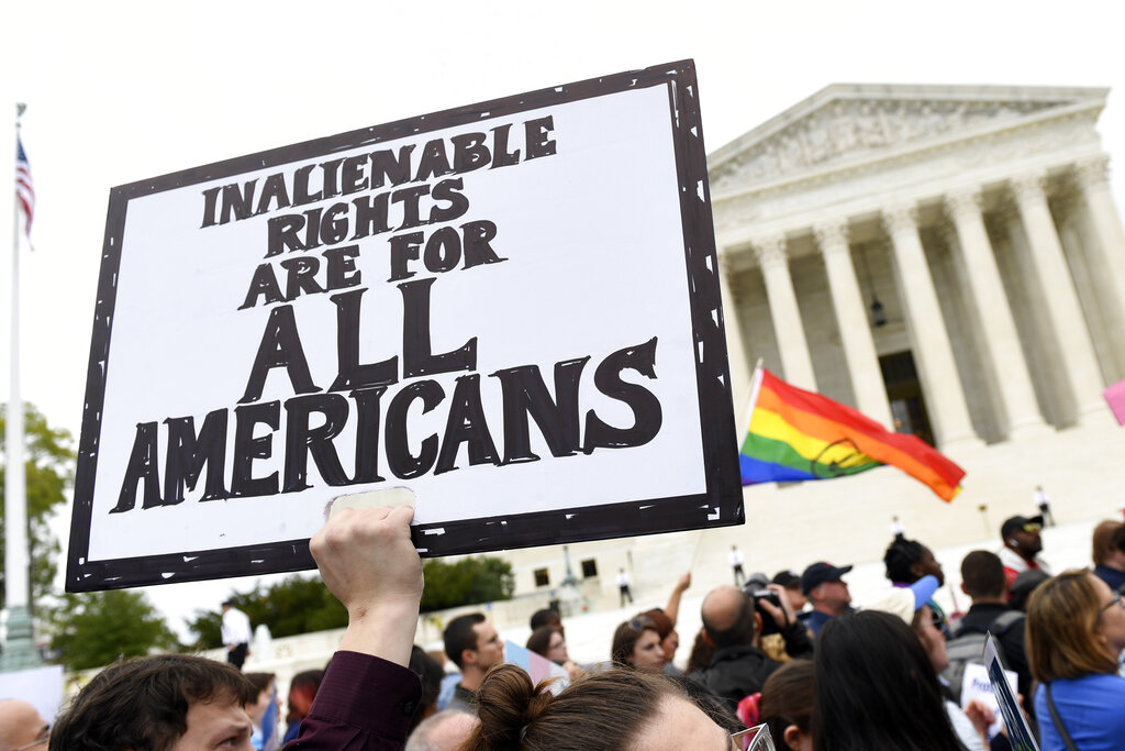FILE - In this Oct. 8, 2019, file photo, protesters gather outside the Supreme Court in Washington where the Supreme Court is hearing arguments in the first case of LGBT rights since the retirement of Supreme Court Justice Anthony Kennedy. As vice president in 2012, Joe Biden endeared himself to many LGBTQ Americans by endorsing same-sex marriage even before his boss, President Barack Obama. Now, as president-elect, Biden is making sweeping promises to LGBTQ activists, proposing to carry out virtually every major proposal on their wish lists. (AP Photo/Susan Walsh, File)
