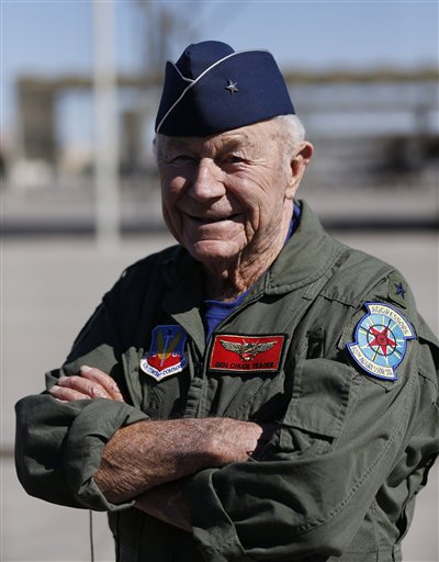 Retired Air Force Brig. Gen. Charles Yeager talks to members of the media following a re-enactment flight commemorating his breaking of the sound barrier 65 years ago on Sunday, Oct. 14, 2012, at Nellis Air Force Base, Nev. (AP Photo/Isaac Brekken)