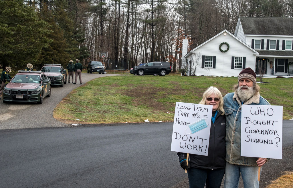 NEWFIELDS – About two dozen people showed up Sunday at Gov. Chris Sununu’s home to protest his executive orders mandating masks and other pandemic-related restrictions.
