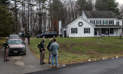 - Photo by JEFFREY HASTINGS Several state troopers stand outside Gov. Chris Sununu’s Newfields home Sunday, monitoring the protesters who showed up to take issue with Sununu’s mask mandates and other pandemic-related orders. (Photo by JEFFREY HASTINGS)