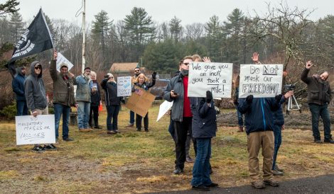 - Photo by JEFFREY HASTINGS About two dozen people showed up at Gov. Chris Sununu’s Newfields home Sunday to protest his executive orders, including mask mandates. (Photo by JEFFREY HASTINGS)