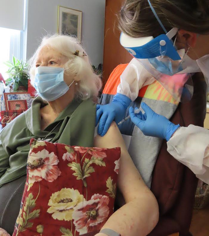 Among the first to get the first of two Pfizer vaccines was Rita Landry, who served in the Air Force during the Korean Conflict. Also, Lorenzo “Joe” Perry, who served in the Navy in World War II, rolled up his sleeve to get the potentially life-saving injection.