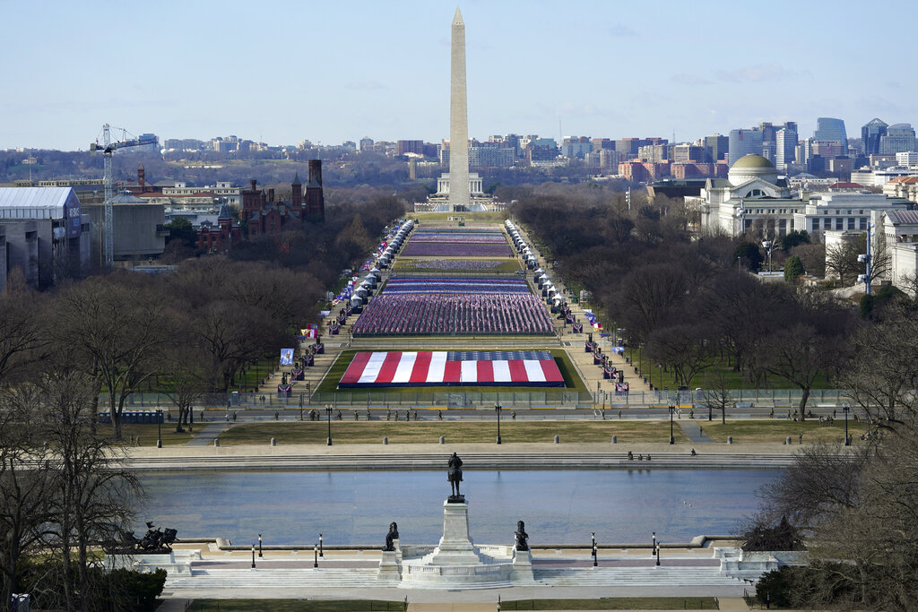A view of the National Mall in Washington, Tuesday, Jan. 19, 2021, ahead of the 59th Presidential Inauguration on Wednesday. (AP Photo/Susan Walsh, Pool)