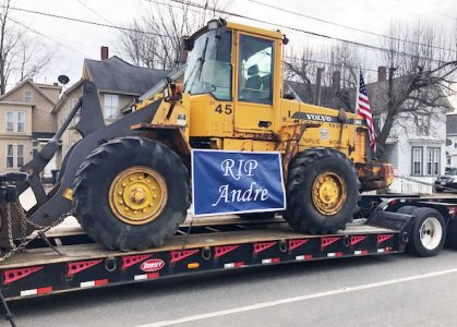 - Courtesy photo A banner bearing a “rest in peace” message for the late Public Works employee Andre Pelletier is affixed to a front-end loader, one of many Public Works vehicles that participated in a parade that paid tribute to the 43-year employee. (Courtesy photo)