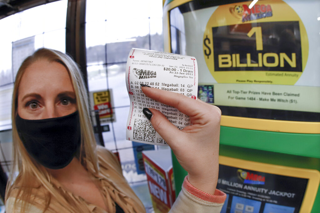 A patron, who did not want to give her name, shows the ticket she had just purchased for the Mega Millions lottery drawing at the lottery ticket vending kiosk in a Smoker Friendly store, Friday, Jan. 22, 2021, in Cranberry Township, Pa. The jackpot for the Mega Millions lottery game has grown to $1 billion ahead of Friday night's drawing after more than four months without a winner. (AP Photo/Keith Srakocic)