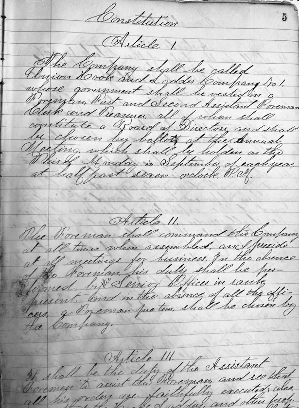 - Courtesy photo The articles that made up the constitution of Nashua’s 1870s Union Hook & Ladder Co. No. 1 occupy the first several pages of the 300-plus page log book that city Fire Marshal Adam Pouliot donated to the Nashua Historical Society. (Courtesy photo)