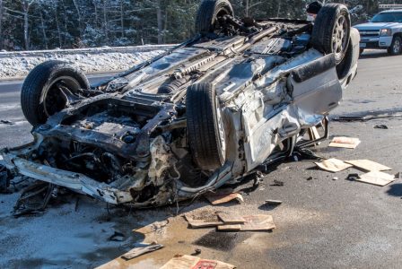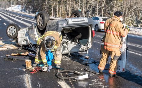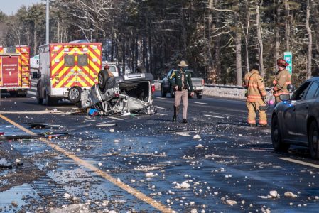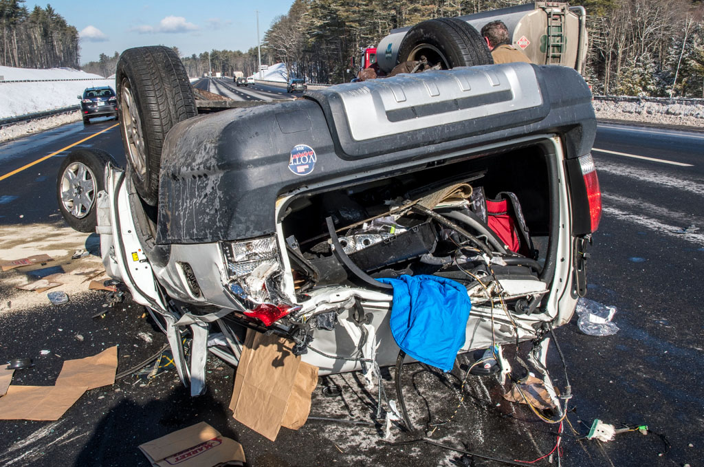 - Photo by JEFFREY HASTINGS The wreckage of a vehicle from which a Massachusetts woman was extricated Wednesday morning lies on its roof on Route 93 in Londonderry. (Photo by JEFFREY HASTINGS)