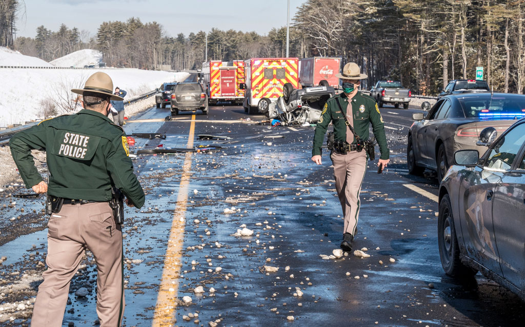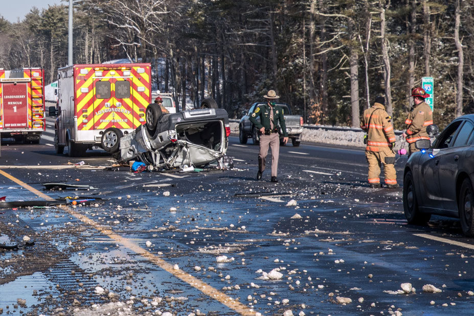 - Photo by JEFFREY HASTINGS Snow, ice and other debris are scattered about the scene of Wednesday morning’s rollover crash on Route 93 in Londonderry as state police troopers begin their investigation. The driver suffered injuries that weren’t believed to be life-threatening. (Photo by JEFFREY HASTINGS)
