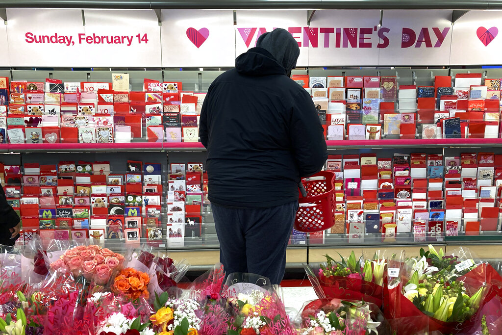 A shopper at a Chicago area store looks over Valentine's Day cards Saturday, Feb. 13, 2021. (AP Photo/Charles Rex Arbogast)