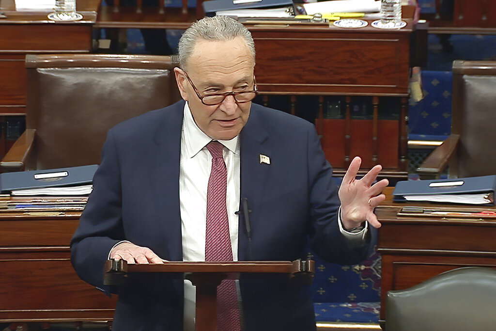 In this image from video, Senate Majority Leader Chuck Schumer of N.Y., calls for a recess after a vote on the motion to allow witnesses in the second impeachment trial of former President Donald Trump in the Senate at the U.S. Capitol in Washington, Saturday, Feb. 13, 2021. (Senate Television via AP)