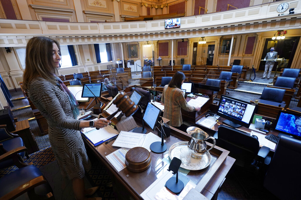 FILE - In this Feb. 10, 2021, file photo, House speaker Del. Eileen Filler-Corn, D-Fairfax, gavels in the session to an empty Virginia House of Delegates chamber after a Zoom Legislative session at the Capitol in Richmond, Va. A year after COVID-19 triggered government shutdowns and crowd limitations, more public bodies than ever are livestreaming their meetings for anyone to watch from a computer, television or smartphone. But in some cases, it's become harder for people to actually talk with their elected officials. (AP Photo/Steve Helber, File)