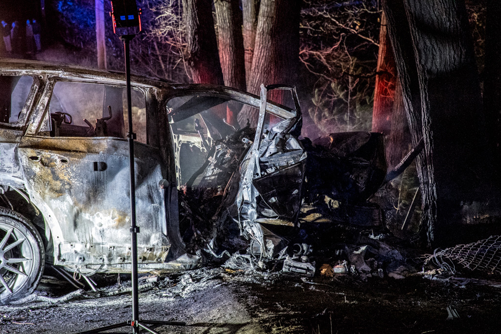Photo by JEFFREY HASTINGS The burned-out shell of the vehicle in which Londonderry teen Jacob Naar was killed Friday night sits on the side of Hardy Road as police conducted their on-scene investigation. (Photo by JEFFREY HASTINGS)