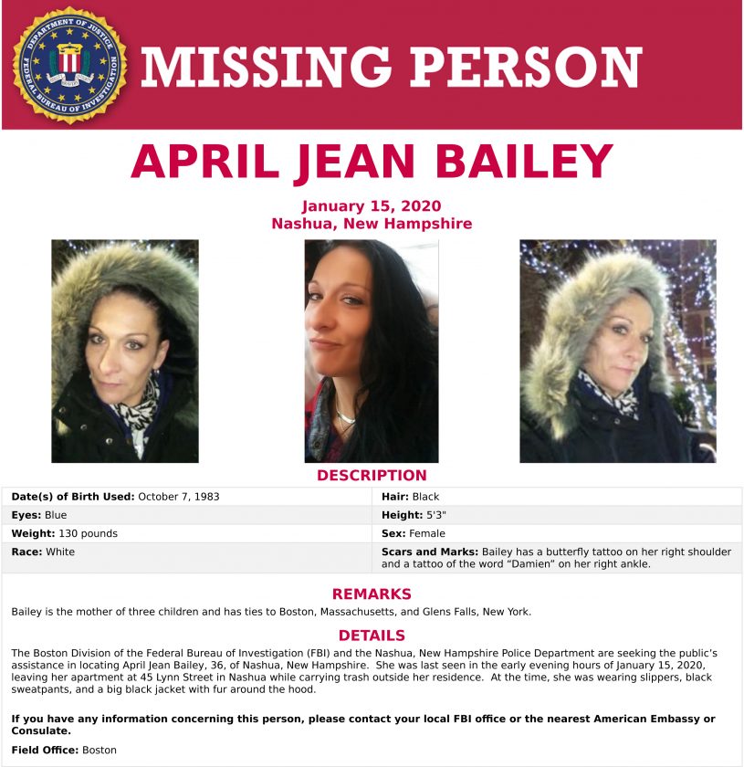 - The missing-person poster distributed by the Boston office of the FBI shows photos and gives details on missing Nashua resident April Jean Bailey.