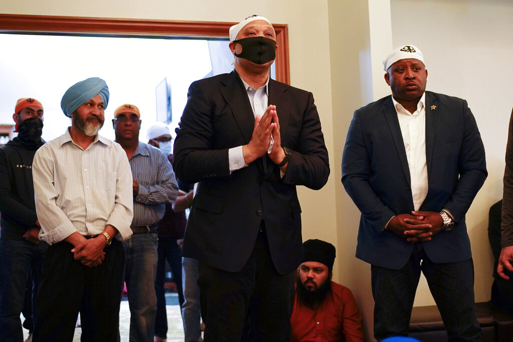 Rep. Andre Carson, D-Ind., speaks with members of the Sikh Coalition at the Sikh Satsang of Indianapolis in Indianapolis, Saturday, April 17, 2021 for a commemoration of the victims of the shooting at a FedEx facility in Indianapolis that claimed the lives of several members of the Sikh community. A gunman killed and wounded several people before taking his own life in a late-night attack at a FedEx facility near the Indianapolis airport. (AP Photo/AJ Mast)