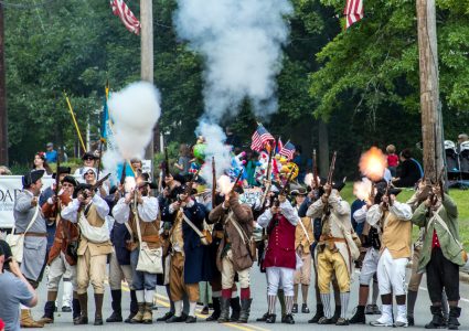 - Photo by JEFFREY HASTINGS Smoke billows from vintage muskets as costumed participants fire a salute during Pepperell’s annual Fourth of July parade on Saturday. (Photo by JEFFREY HASTINGS)