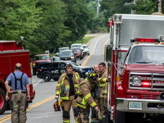 - Photo by JEFFREY HASTINGS Milford firefighters take a breather after successfully rescuing the drivers of two cars that collided head-on Sunday afternoon on Route 13. (Photo by JEFFREY HASTINGS)
