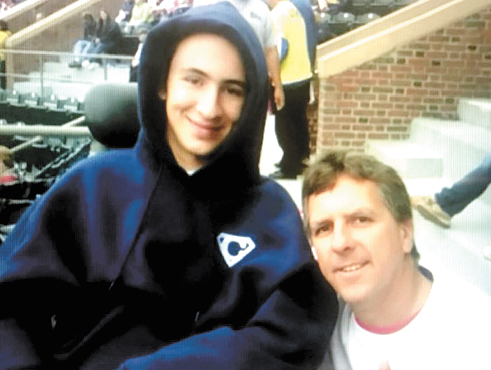 Cooper Doucette, the Nashua youth paralyzed during a football practice 11 years ago, at Holman Stadium with Ray Keefe, the Holls man raising funds to replace Cooper's specially equipped van. (Courtesy photo)